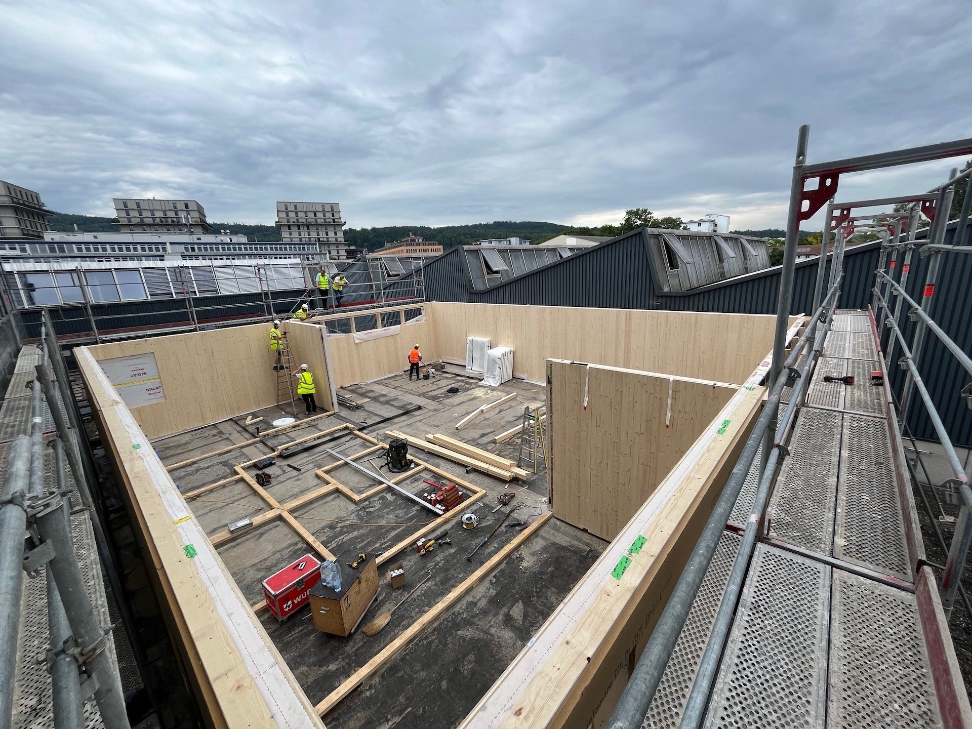 Die Montage der vorgefertigten Holzrahmenkonstruktion erfolgte mittels Funk ohne direkte Einsicht durch den Kranführer.