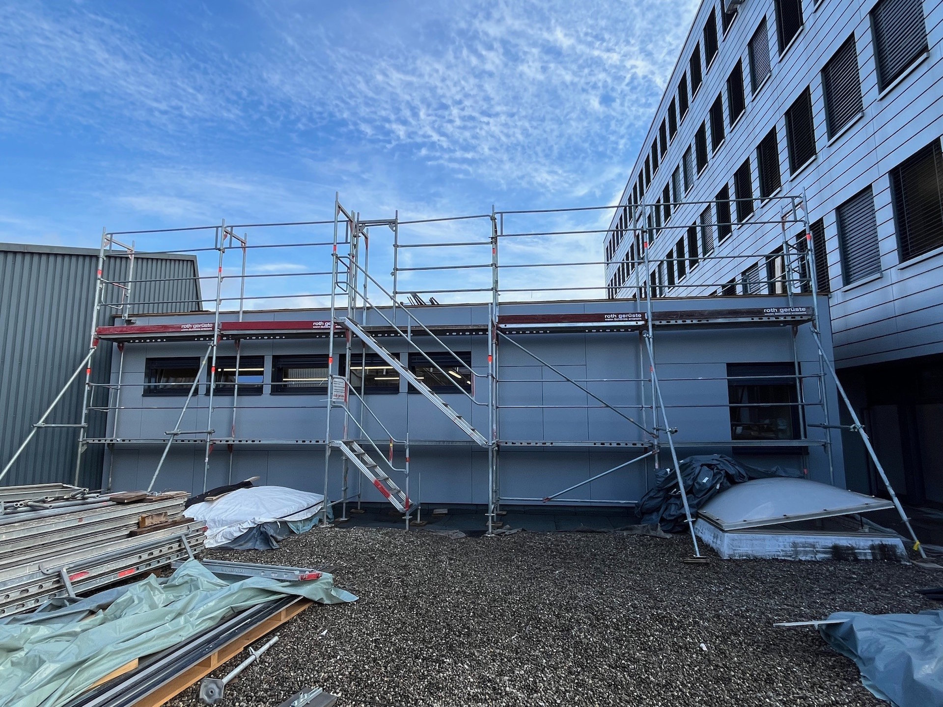 Während des laufenden Betriebs der Verkehrsbetriebe Zürich konnten wir im Herbst 2024 auf dem Hallendach der Tram-Abstellanlage neue Sozialräume errichten.